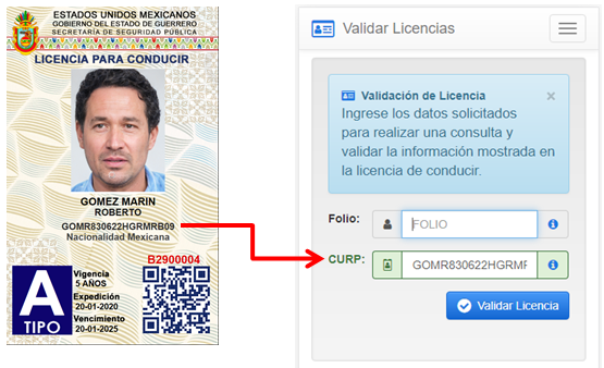 No se encontró coincidencia al consultar el número de FOLIO: y el RFC/CURP: que se ha ingresado para validar la licencia de conducir, es posible que dicha información aún no ha sido compartida por la institución que expidió la licencia, una vez que la información sea integrada a la Base de Datos de Plataforma México estará disponible para su consulta, verificación y validación por este medio. Consulte nuevamente después de 10 dias o solicite una aclaración en la institución donde realizó el trámite de la licencia. |